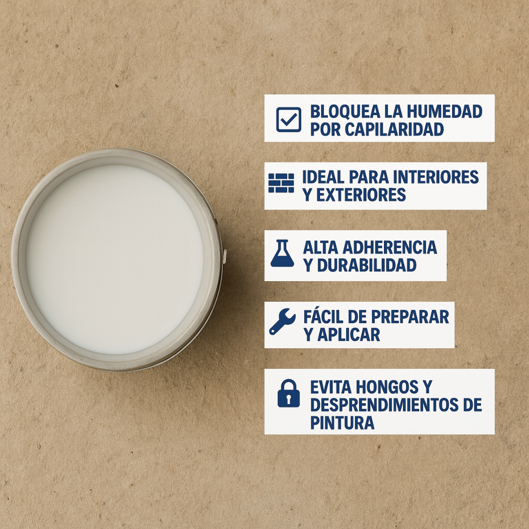 Es un sellador antihumedad de alta eficacia, diseñado para eliminar manchas, olor a humedad y prevenir la aparición de hongos en paredes, techos y superficies porosas.